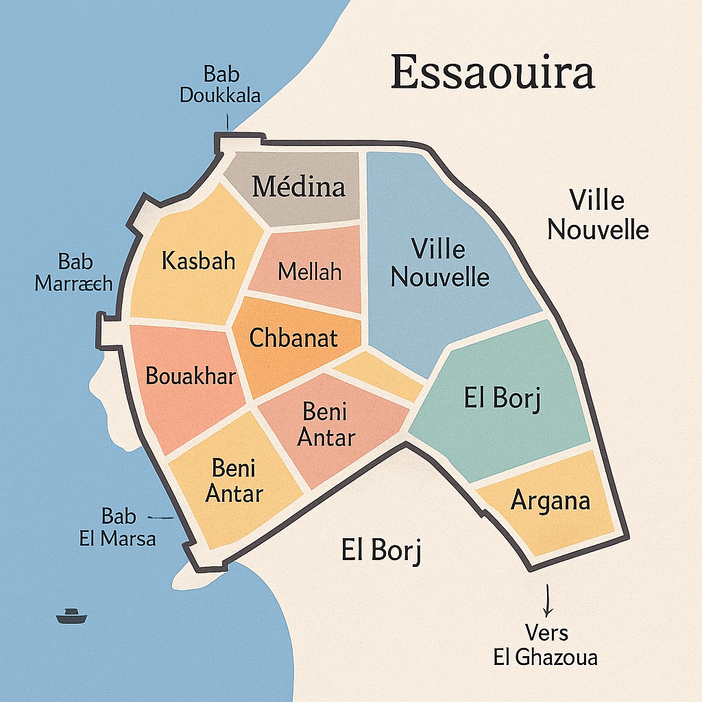 Essaouira, surnommée la “Perle de l’Atlantique”, est une ville côtière marocaine connue pour son atmosphère détendue, son patrimoine historique et son ouverture sur le monde. Que vous soyez voyageur de passage ou expatrié installé, comprendre les différents quartiers d’Essaouira est essentiel pour s’y orienter, choisir où vivre ou simplement profiter pleinement de l’expérience locale.